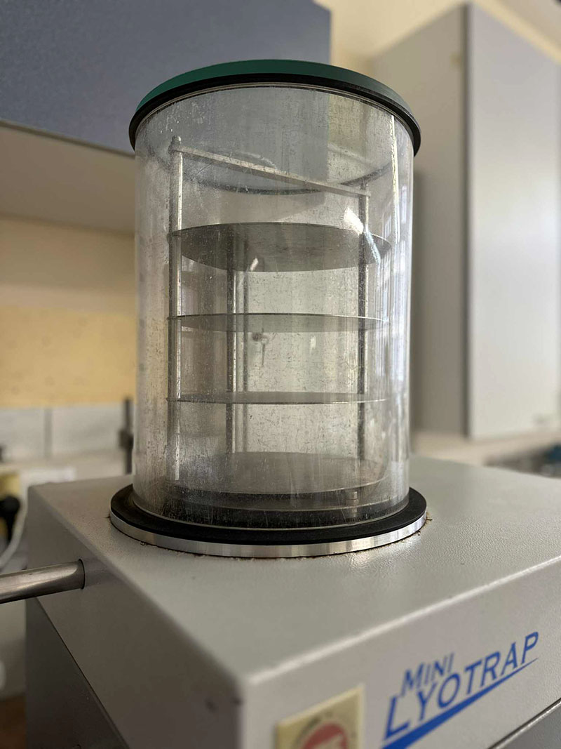 Freeze drying is a process of sublimation of frozen water from a sample under vacuum conditions. Two of the most important differences between freeze drying and other types of drying are: with freeze drying material solidifies before the actual drying and the removal of water from the material occurs with a process of sublimation, i.e. direct transition from ice into vapour. By freezing the sample we achieve a partial dehydration of the sample, its solidification and the shaping of the samples morphology. Its implementation retains the porous structure of materials, amongst other features, and is a convenient procedure for preparation of aerogels.