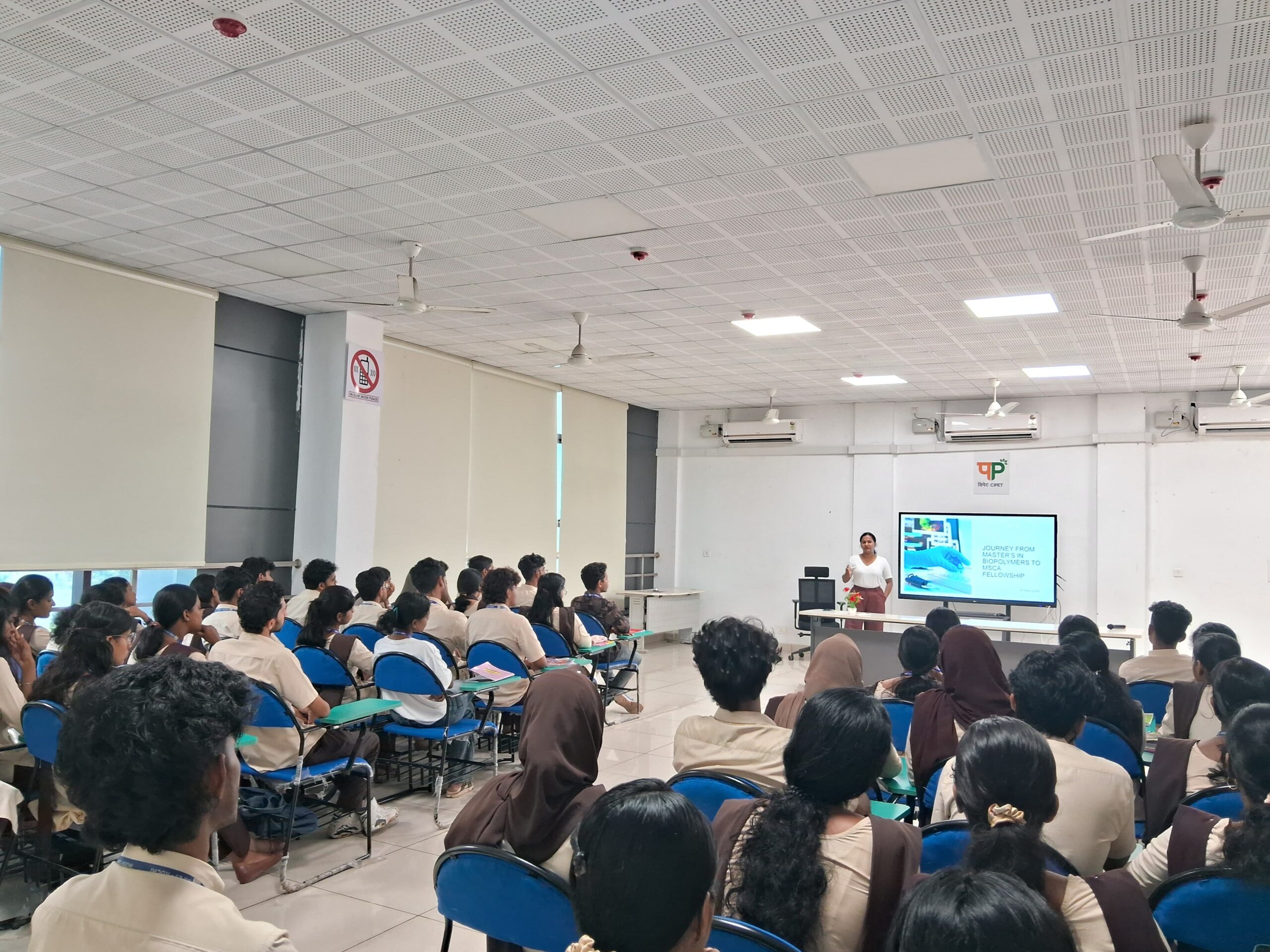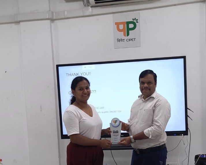 Athira also presented part of her ongoing Ph.D. research on polylactic acid (PLA)-based sustainable food packaging materials, giving students a glimpse into cutting-edge developments in polymer science and their applications in sustainable solutions. She emphasized how her academic foundation in Biopolymer Science at CIPET-IPT continues to support her current research journey.